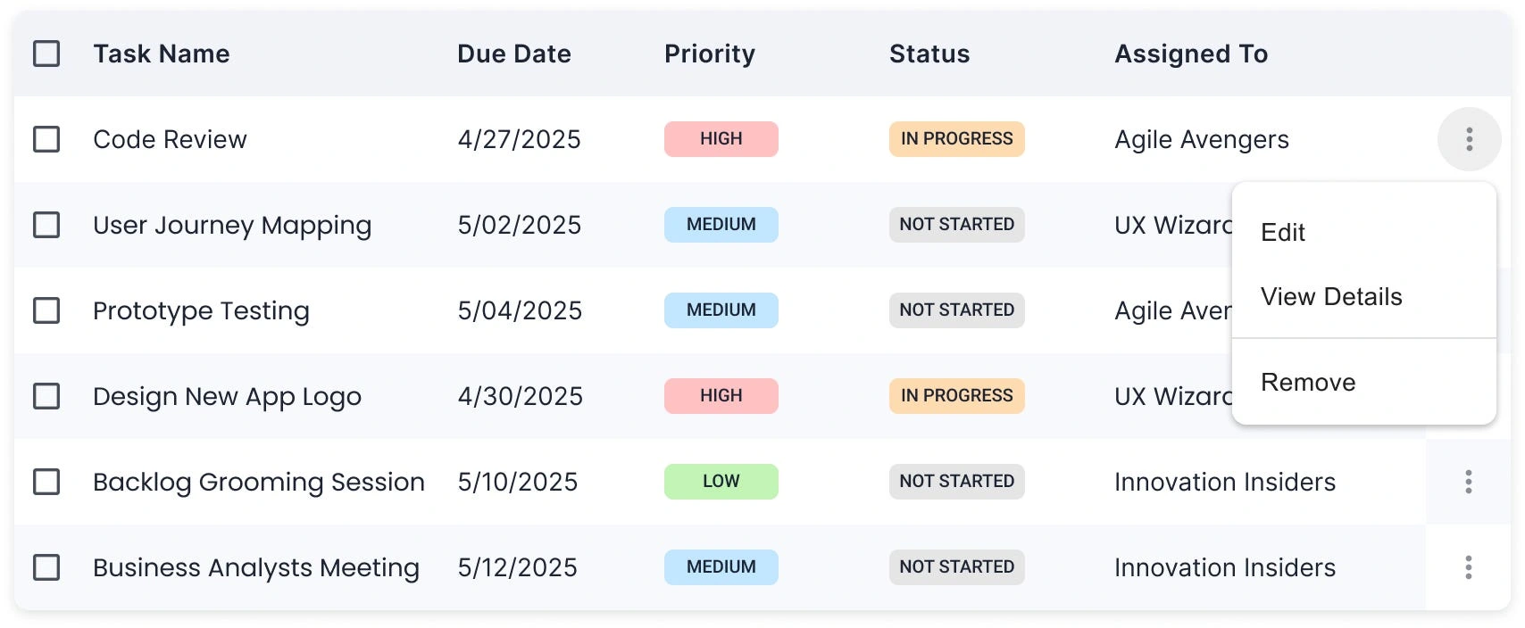Размещение значков непосредственно рядом с содержимым первой ячейки (например, названием задачи или ID) работает хорошо, когда действия тесно связаны с идентификатором. Такой подход обеспечивает мгновенный контекстный контроль.