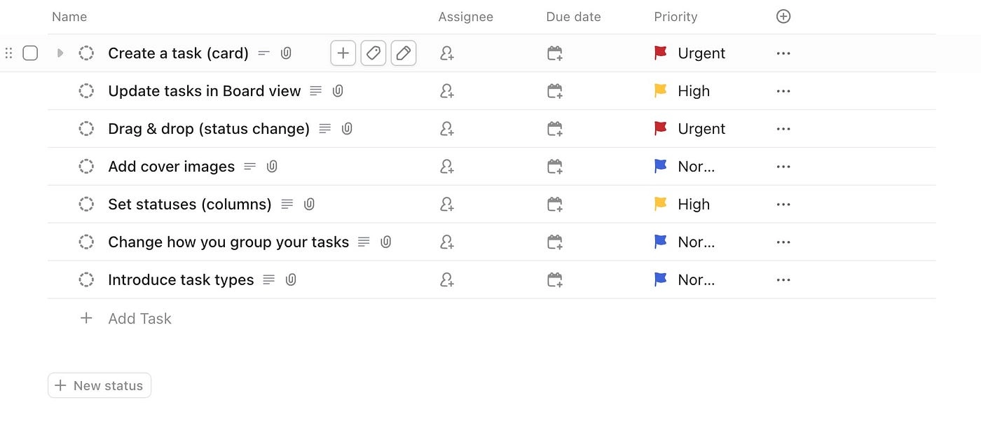 ClickUp отображает действия, применимые к конкретной строке, в первом столбце, когда пользователь наводит на нее курсор.