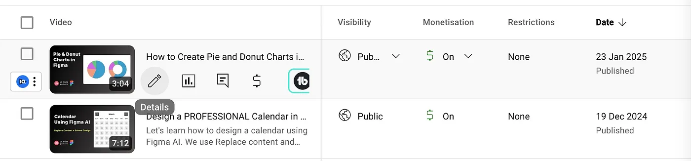 Аналогичным образом, YouTube отображает действия в первом столбце той строки, на которую пользователь навел курсор.