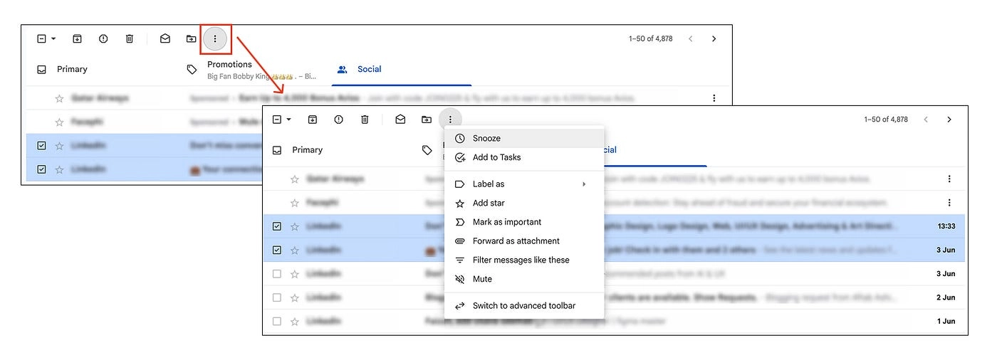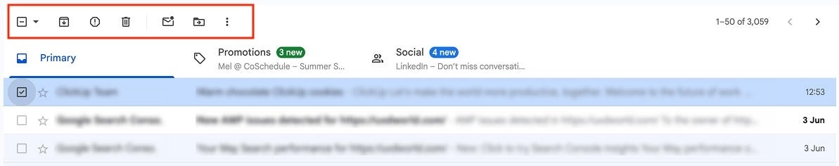 Когда пользователь выбирает несколько писем, Gmail отображает сверху панель с опциями «Удалить», «Архивировать», «Отметить как прочитанное» и т.д.