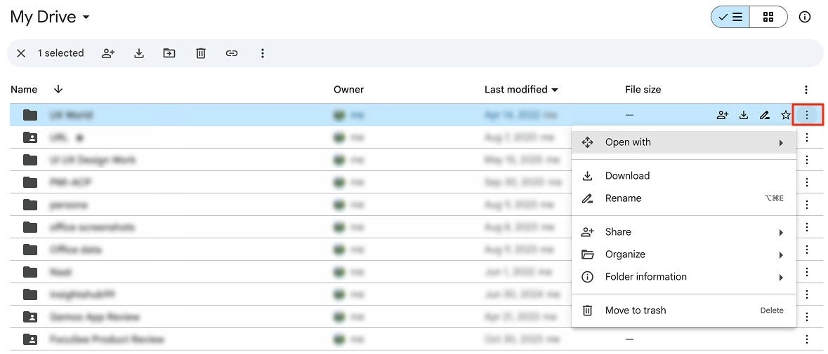 В Google Drive меню с дополнительными опциями («Скачать», «Переименовать», «Поделиться» и другими) для каждого файла открывает вертикальное многоточие (⋮).
