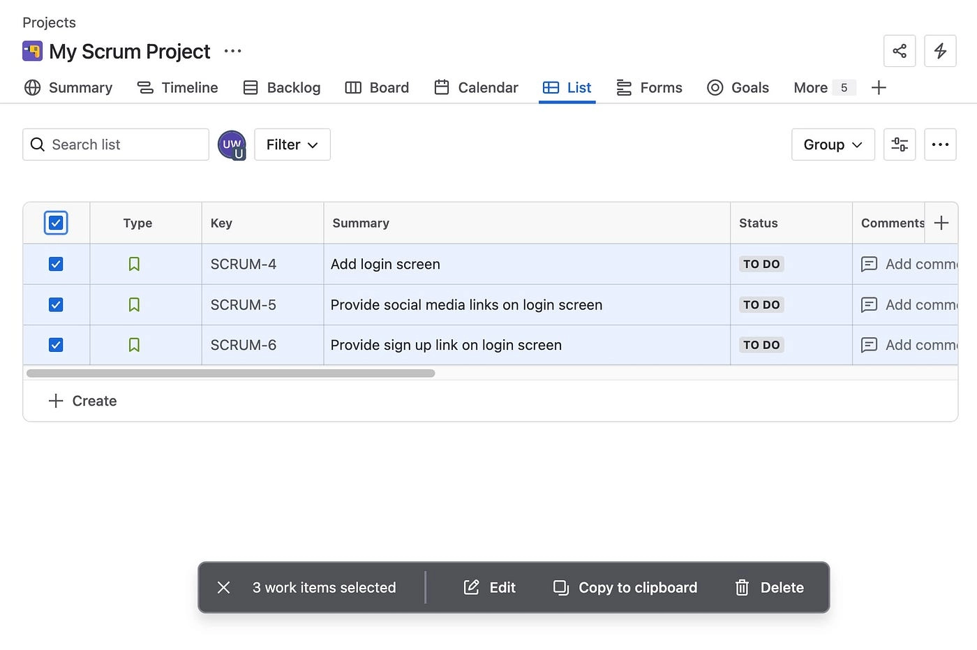 Когда пользователи выбирают несколько элементов в Jira, снизу появляется плавающая панель с массовыми действиями — «Редактировать», «Копировать в буфер обмена», «Удалить».