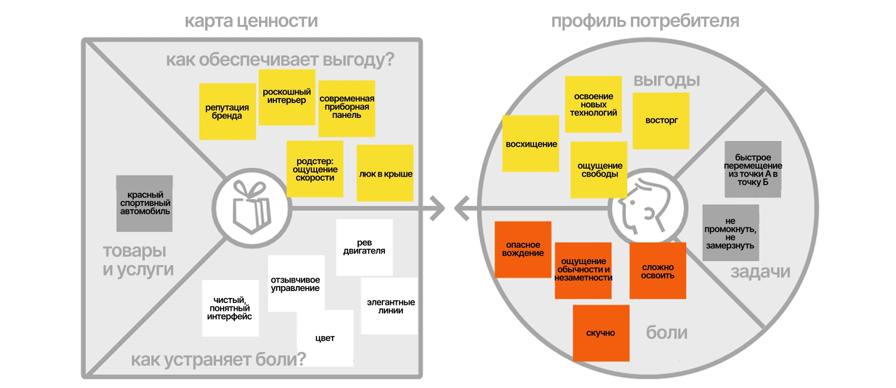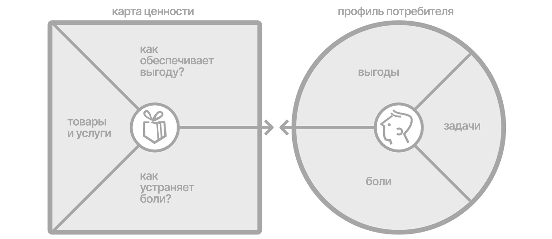 Существуют разные инструменты и фреймворки для отображения потребностей. Один из них — Value Proposition Canvas или канва ценностного предложения. Она помогает систематизировать эмоциональные боли, выгоды и функциональные потребности аудитории и определить, что делает продукт для их удовлетворения.