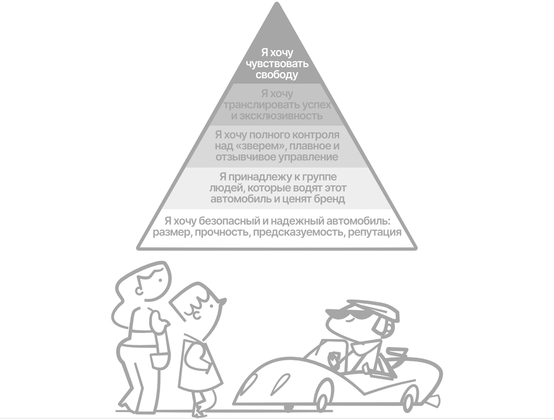- На самом верху находится потребность в самореализации: автомобиль дает свободу ехать туда, куда хочет пользователь.