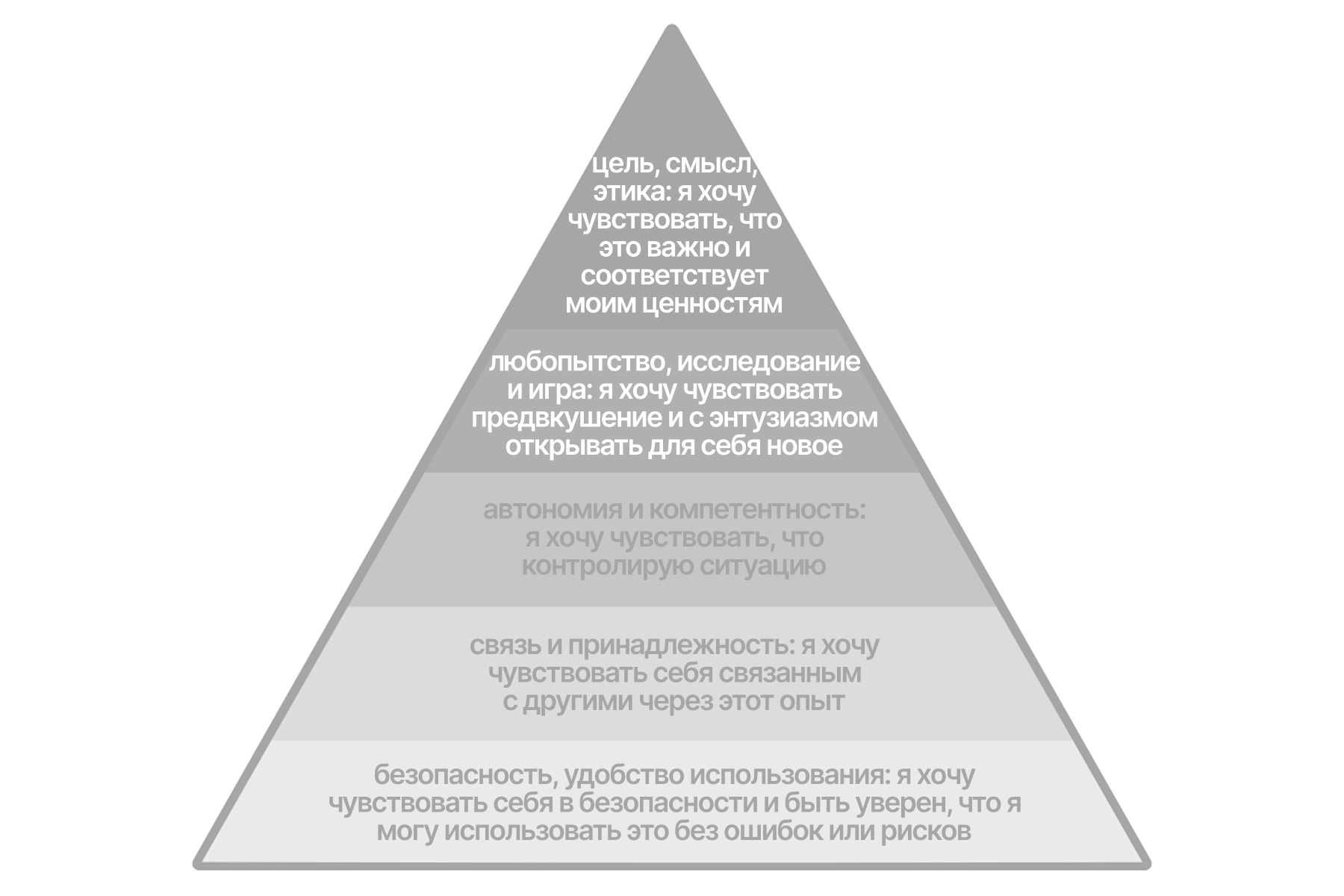 Подведем итог: низкие уровни необходимы, а высокие — превращают опыт в нечто особенное. Дизайн, игнорирующий базовые потребности, вызывает разочарование. Дизайн, достигающий высшего уровня, создает смысл и формирует лояльность.