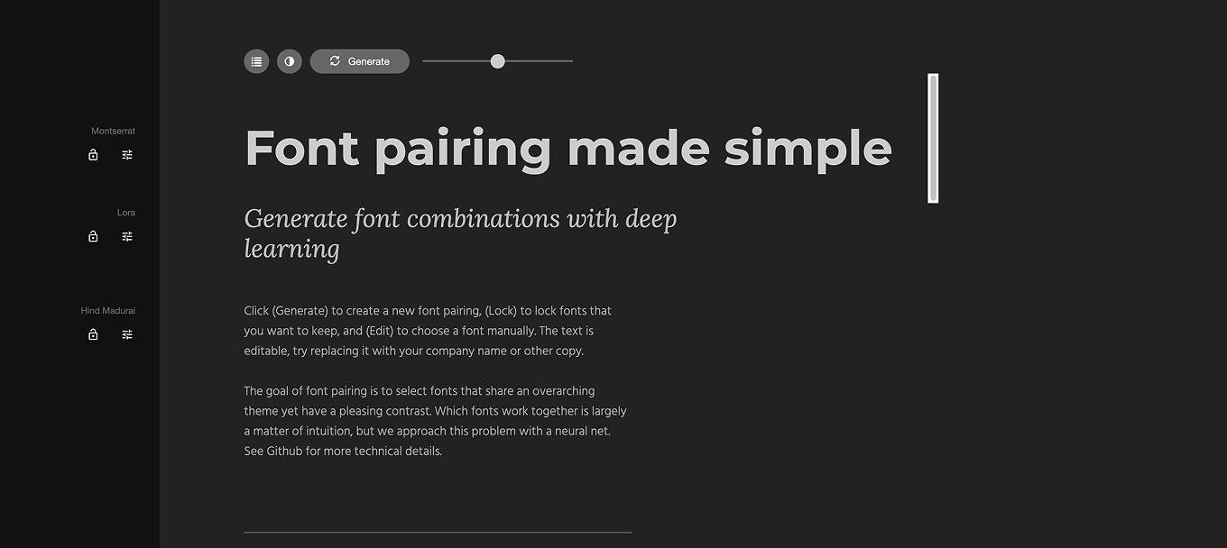 Этот сервис помогает дизайнерам подбирать гармоничные пары шрифтов, используя модель машинного обучения. Несмотря на сложный алгоритм внутри, интерфейс максимально простой и понятный. Вы можете задать уровень контраста между шрифтами с помощью бегунка — от легкого сходства до полного противопоставления, что удобно для поиска нужного настроения интерфейса или бренда.