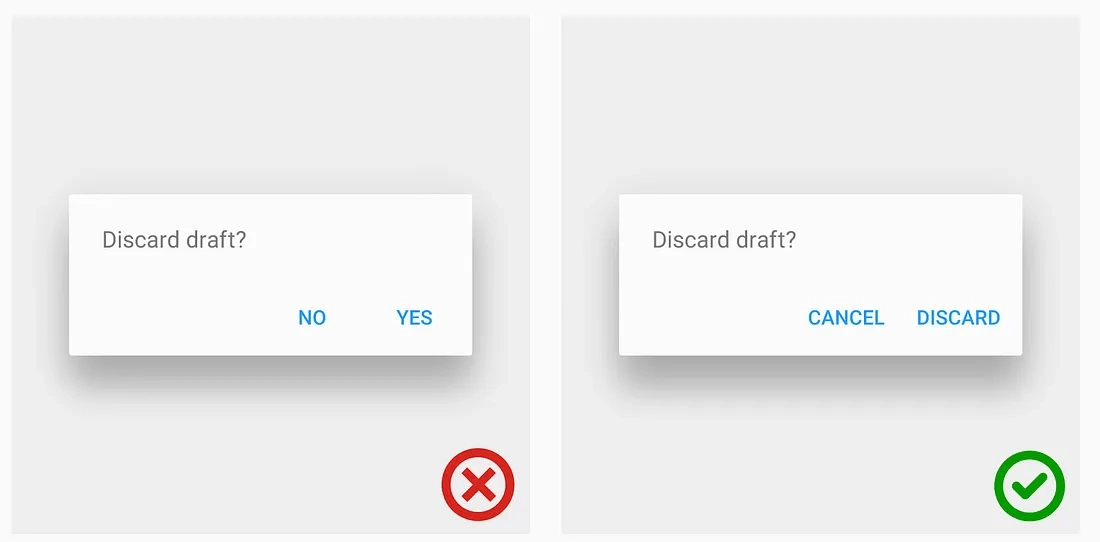 Избегайте расплывчатых формулировок, таких как «ОК» или «Да/Нет», которые не отражают, с чем именно соглашается или от чего отказывается пользователь.