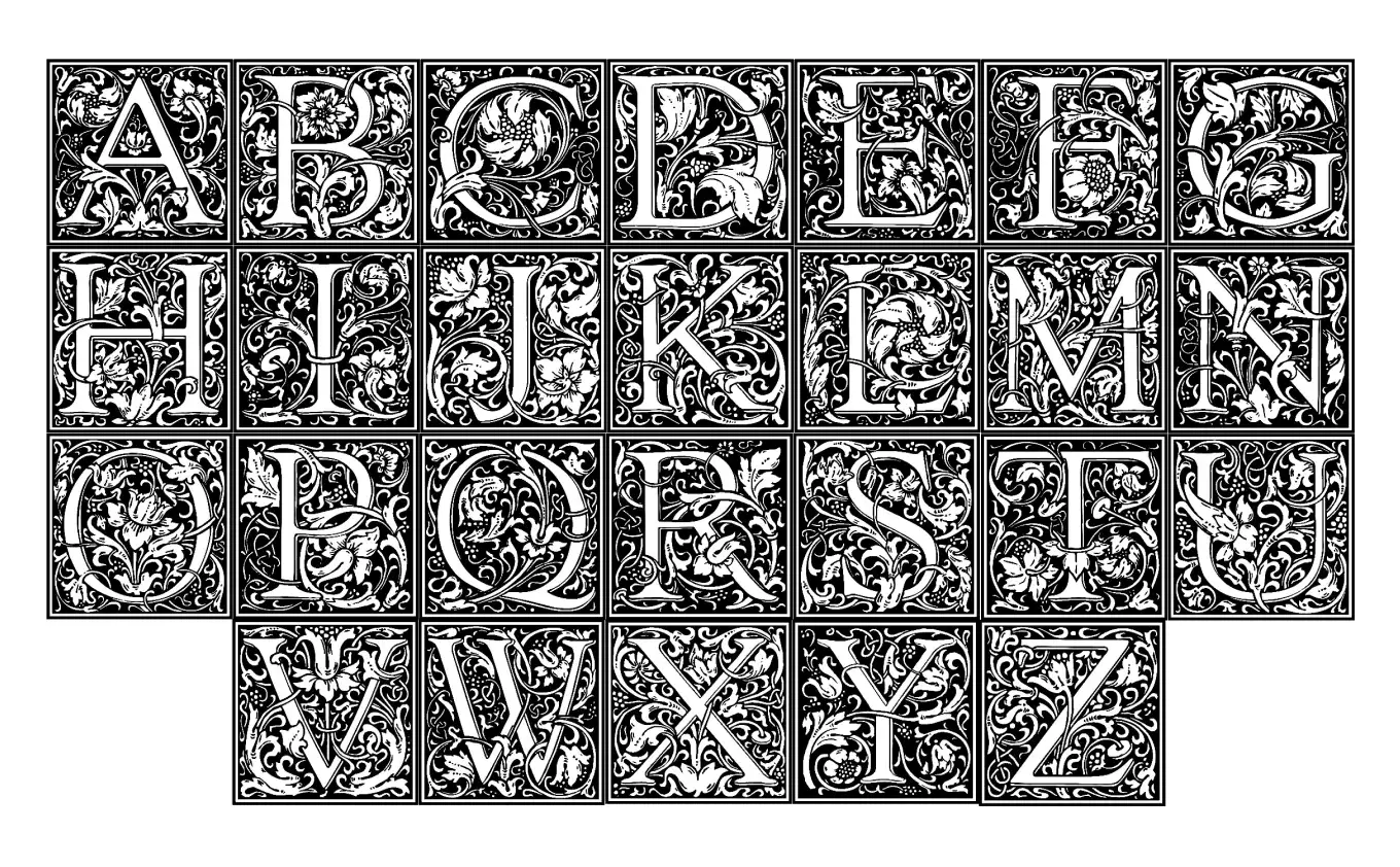 Декорированные. Шрифты с контуром, орнаментом и различными декоративными элементами. Например, Sapphire, Cloister Initials.