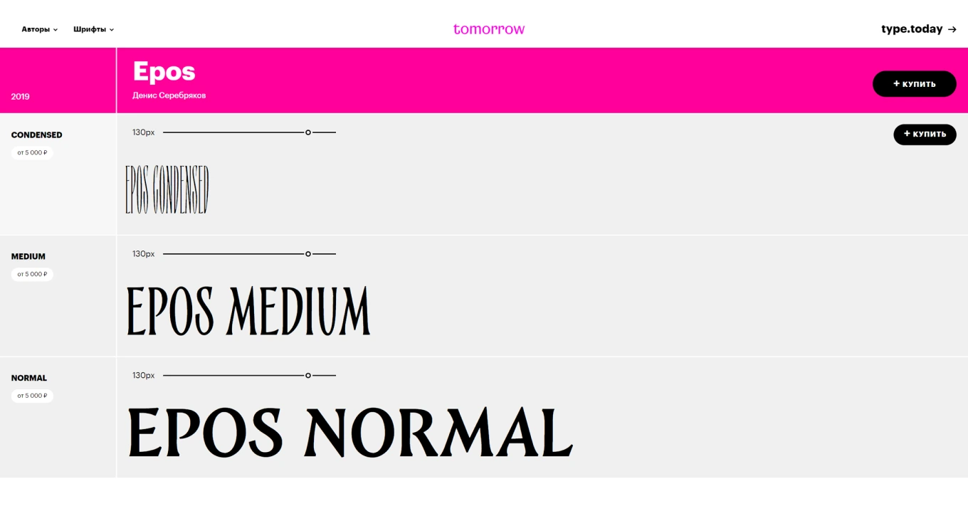 Этот шрифт разработал дизайнер Денис Серебряков. Пример историзма в современном акцидентном шрифте. Это семейство из 3 начертаний, которые сильно отличаются друг от друга.