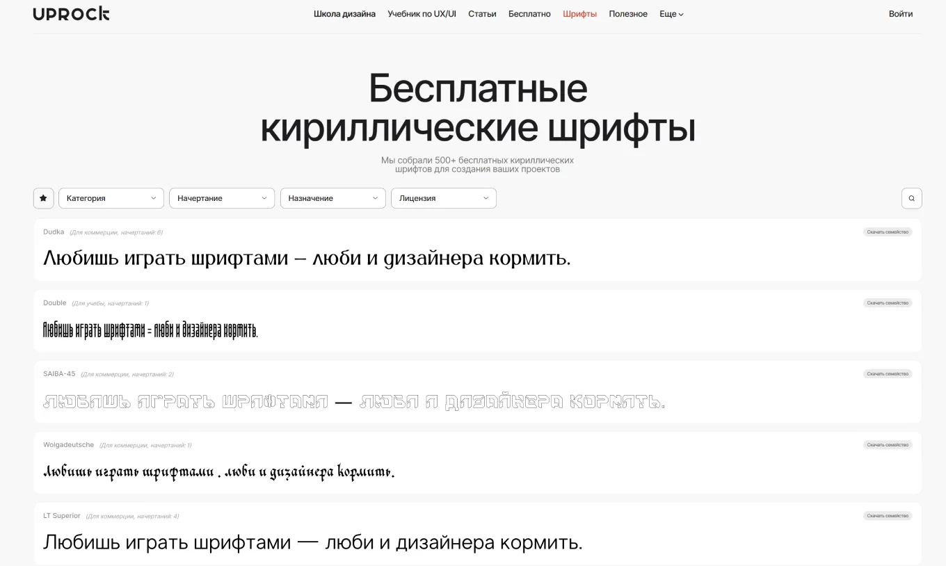 Фильтрация по категориям, начертаниям, назначению и, самое главное, по лицензии! Выберите категорию display, добавьте другие фильтры по необходимости и получите список подходящих вариантов.