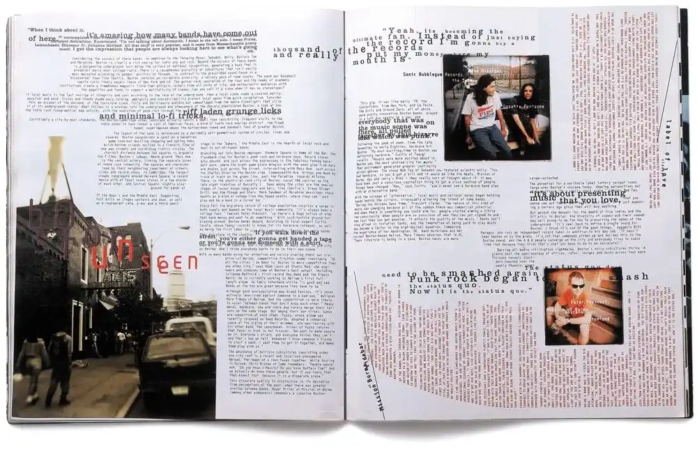 Антидизайн обожает игру со шрифтами: в одном плакате может быть пять разных гарнитур, буквы разных размеров, смещения и даже намеренные орфографические «ошибки». Так работал Дэвид Карсон: его страницы для Ray Gun выглядели как шумный разговор, где шрифт — это эмоция, а не строгий инструмент.